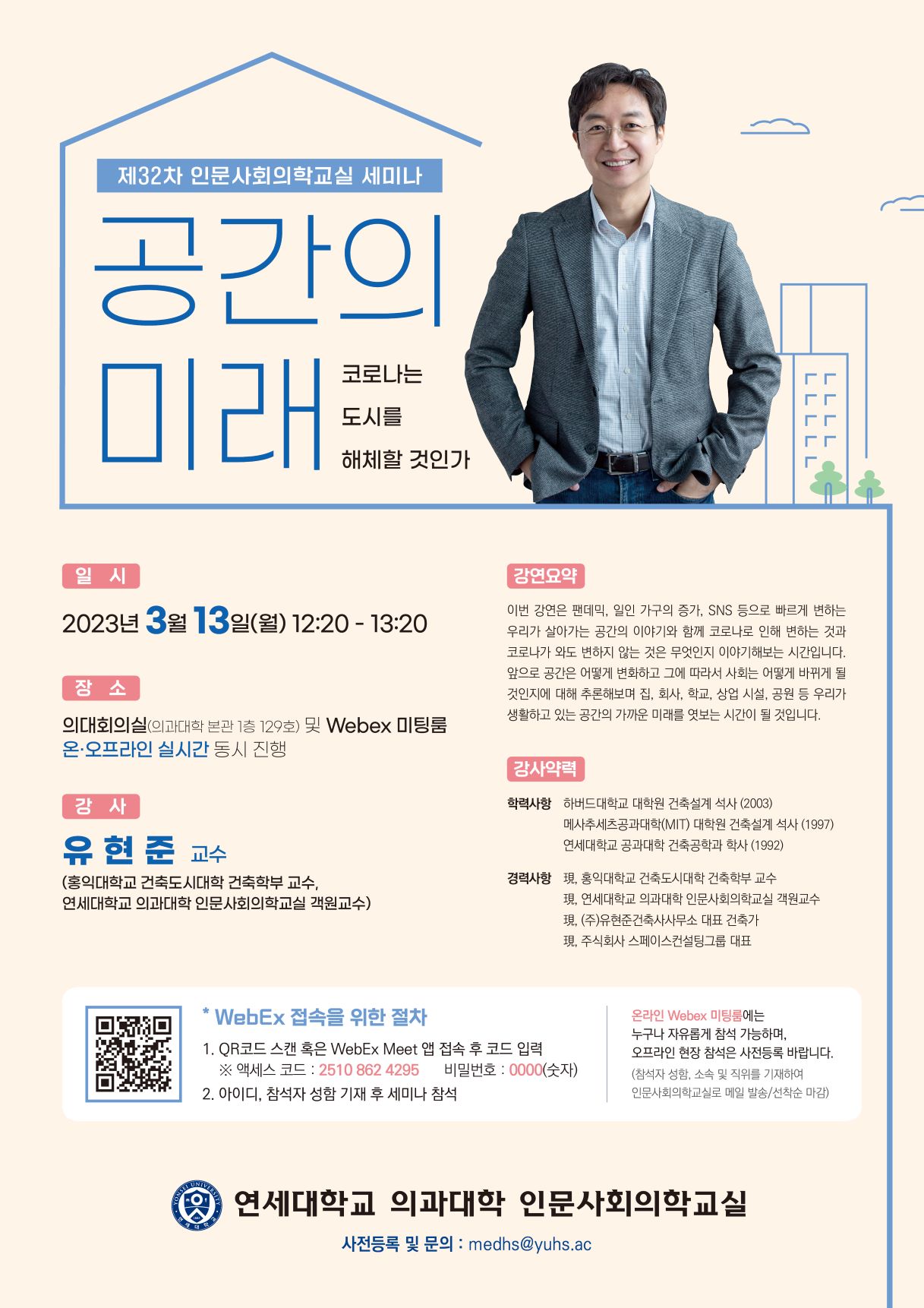 - 강 사 : 유현준 교수 (홍익대학교 건축도시대학 건축학부 교수/연세의대 인문사회의학교실 객원교수)