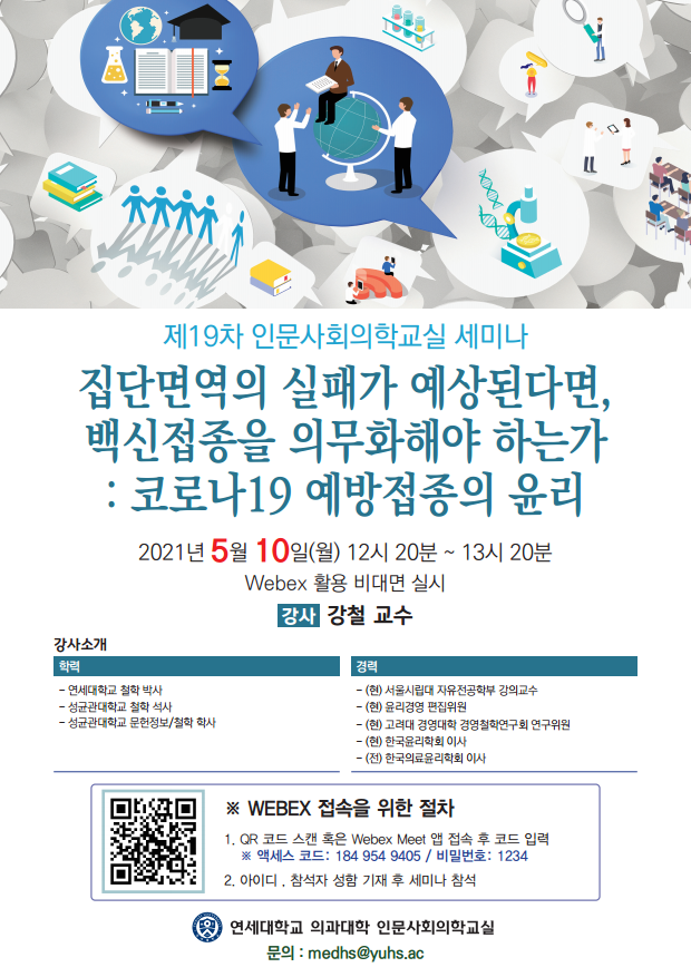 - 주 제 : "집단면역의 실패가 예상된다면, 백신접종을 의무화해야 하는가 : 코로나19 예방접종의 윤리"